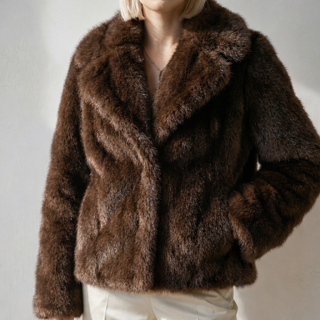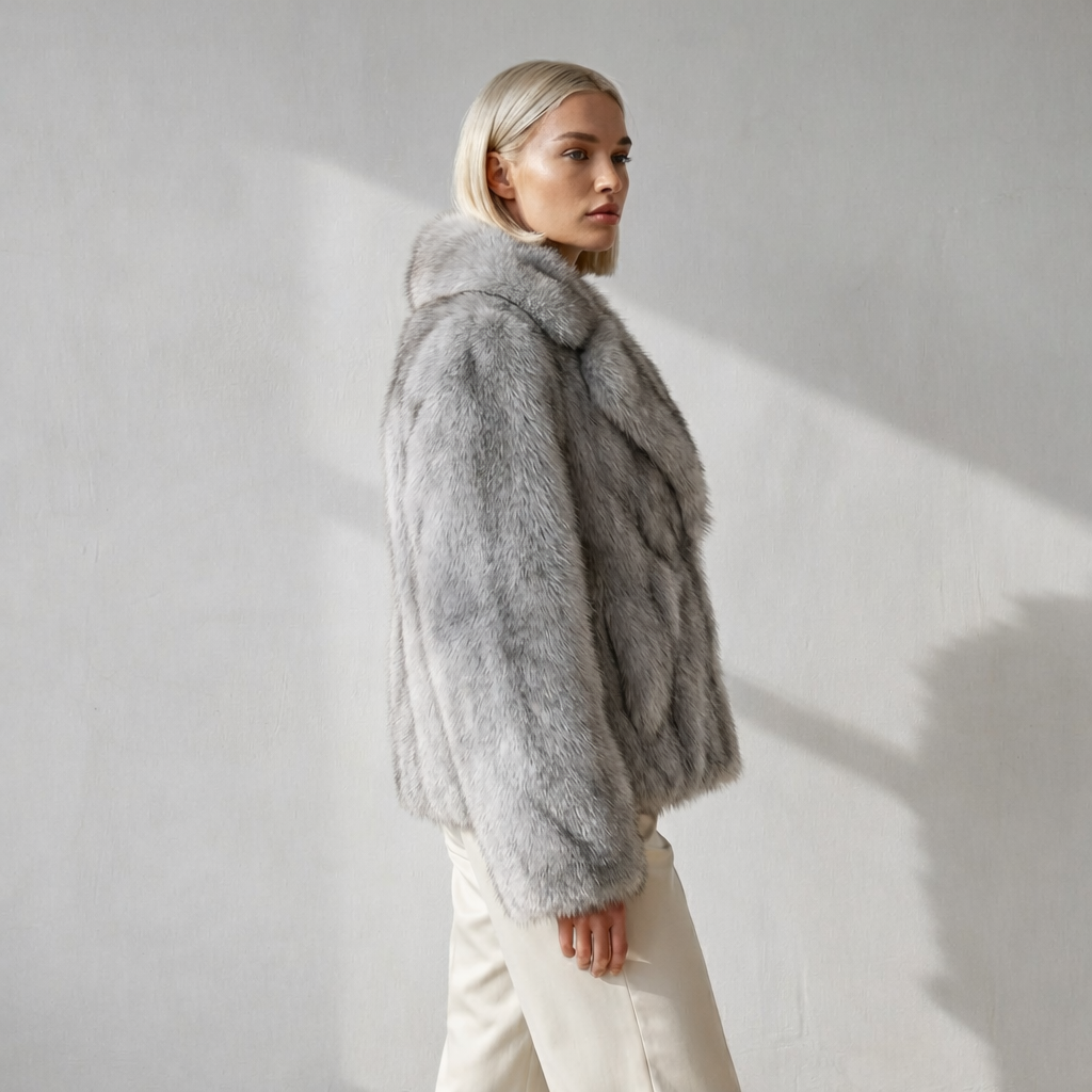 Abrigo de estética sofisticada y carácter sereno, diseñado para aportar presencia sin excesos. Su silueta estructurada y el acabado en pelo sintético de tacto sedoso crean un equilibrio entre volumen, elegancia y funcionalidad. De corte corto y líneas depuradas, incorpora solapa amplia, bolsillos laterales discretos y cierre frontal oculto que mantiene la limpieza visual del diseño.