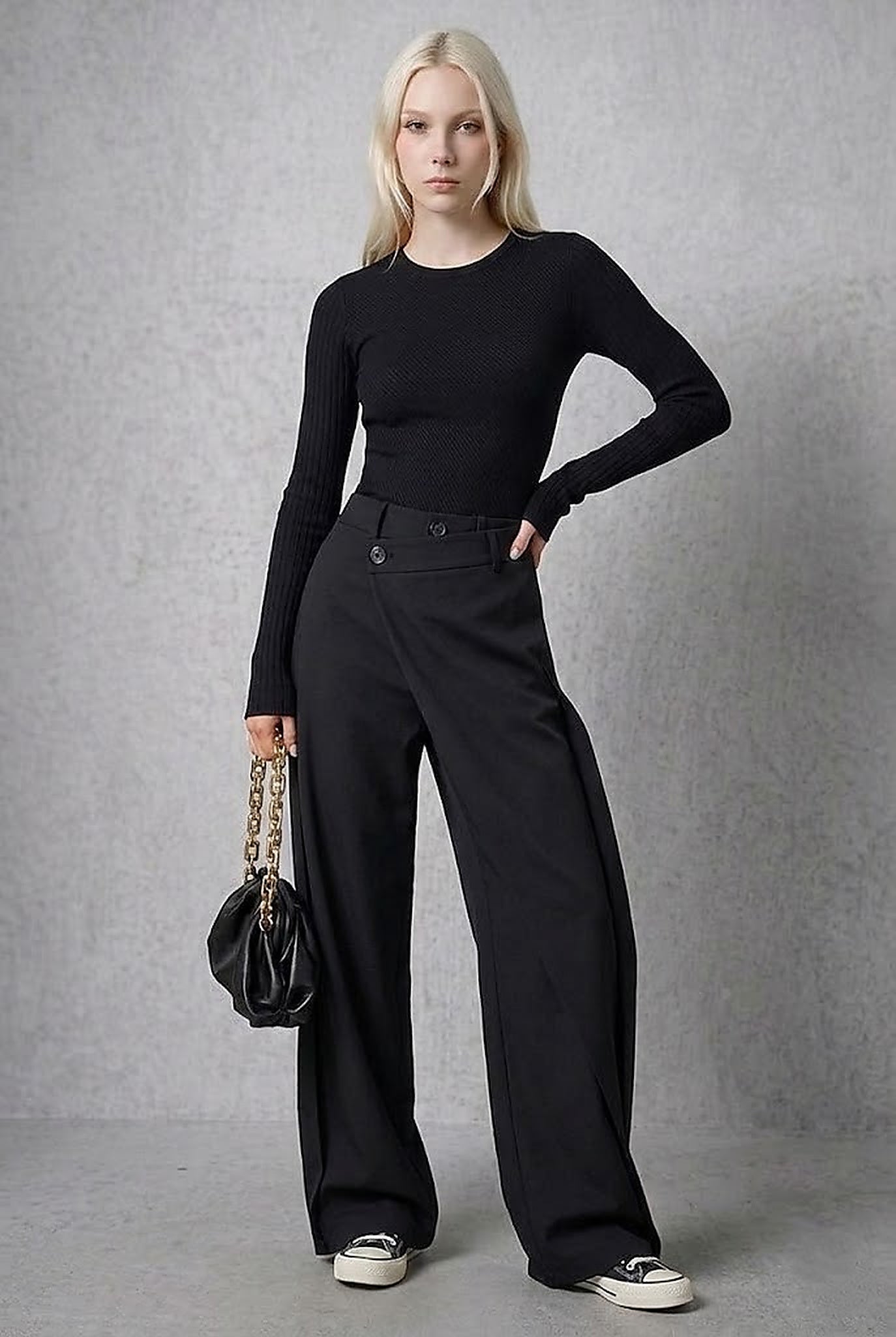 Un pantalón de diseño contemporáneo que destaca por su estructura asimétrica y su silueta amplia. El cruce frontal con doble botón aporta carácter y definición a la cintura, mientras que la caída fluida del tejido crea una estética moderna y sofisticada.