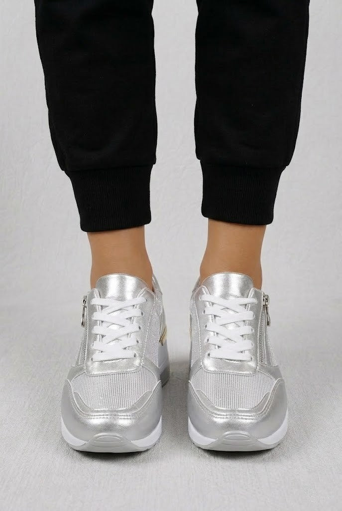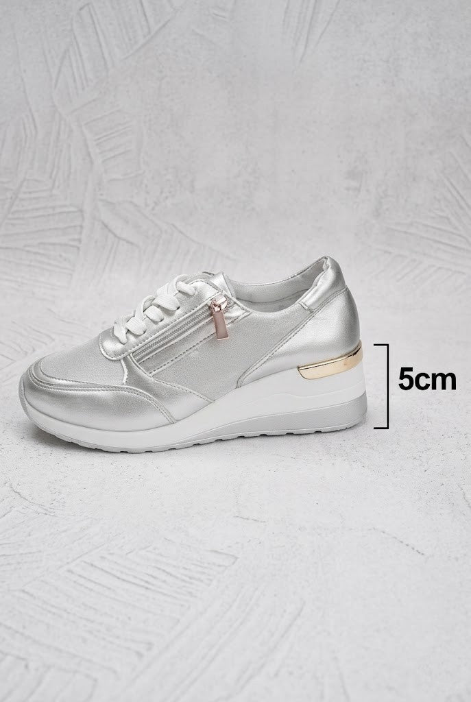 Disfruta de una combinación perfecta entre estilo y comodidad. Estas zapatillas destacan por su elegante acabado metalizado y su suela de cuña, que estiliza la silueta mientras ofrece una pisada suave y estable.