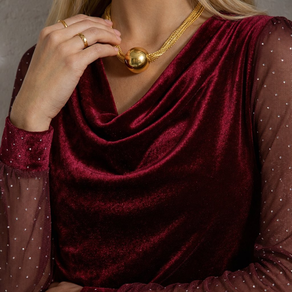 - Cuello drapeado con caída suave y efecto envolvente